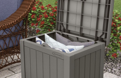 22 gallon small deck box with storage seat - stoney all-weather construction provides water resistance and uv protection ideal for cushions, yard gear & pool supplies reinforced lid offers a unique seating & storage solution for indoor & outdoor use low maintenance - easy to clean & maintain easy assembly- no tools required 5 year limited warranty