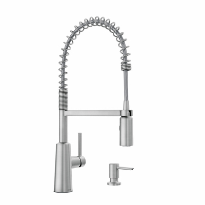 Moen Nori Pre-Rinse Spring Kitchen Faucet. The Modern fashion of the Nori collection makes a bold statement in any kitchen. From intimate galley kitchens to large gourmet workstations, Nori faucets bring a refreshed, Modern look to your home. Simple lines create the contemporary style, while delivering in-demand functionality.